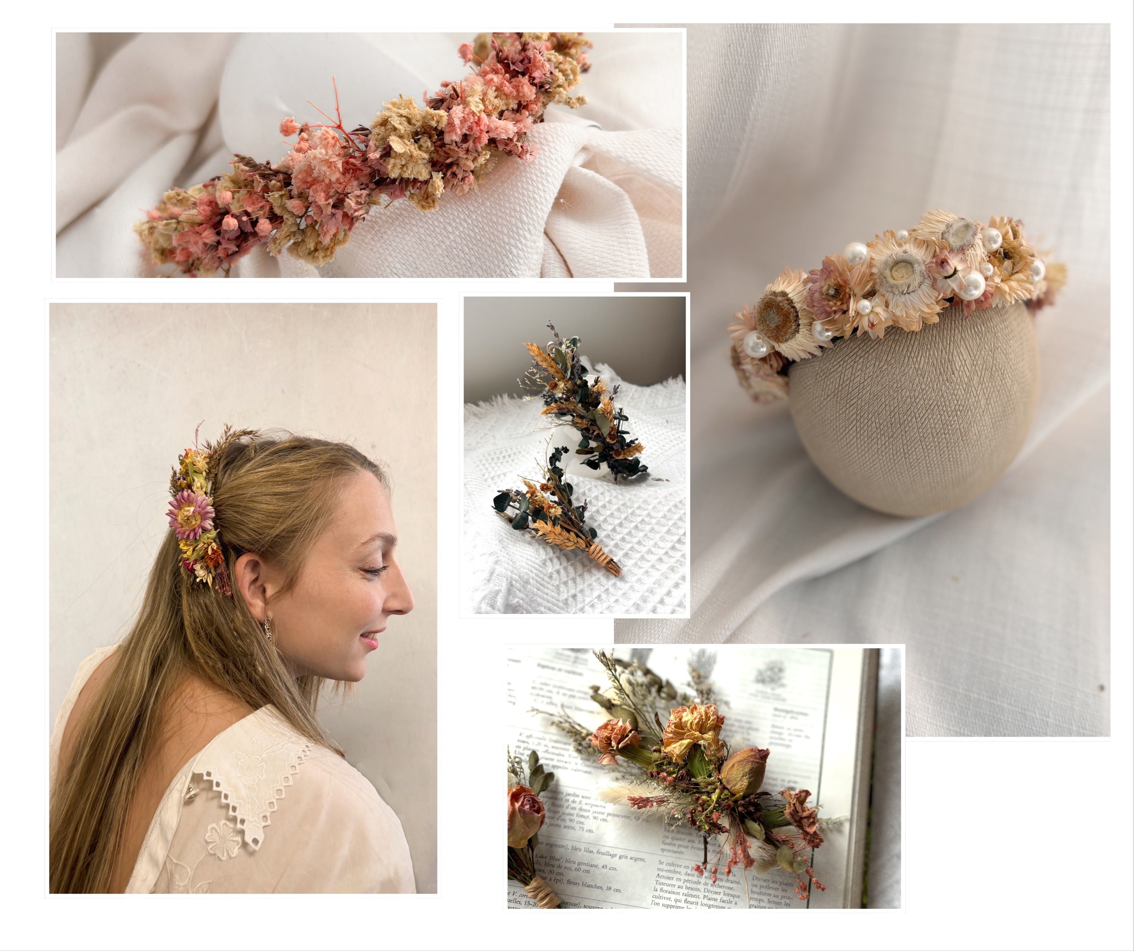Lors de cet atelier à domicile, les invitées apprendront à confectionner des couronnes ou des peignes en fleurs séchées et surcyclées. Un moment ludique et écoresponsable, où chacune repartira avec sa création personnalisée, parfaite pour immortaliser cette journée spéciale avec élégance et originalité.✨
