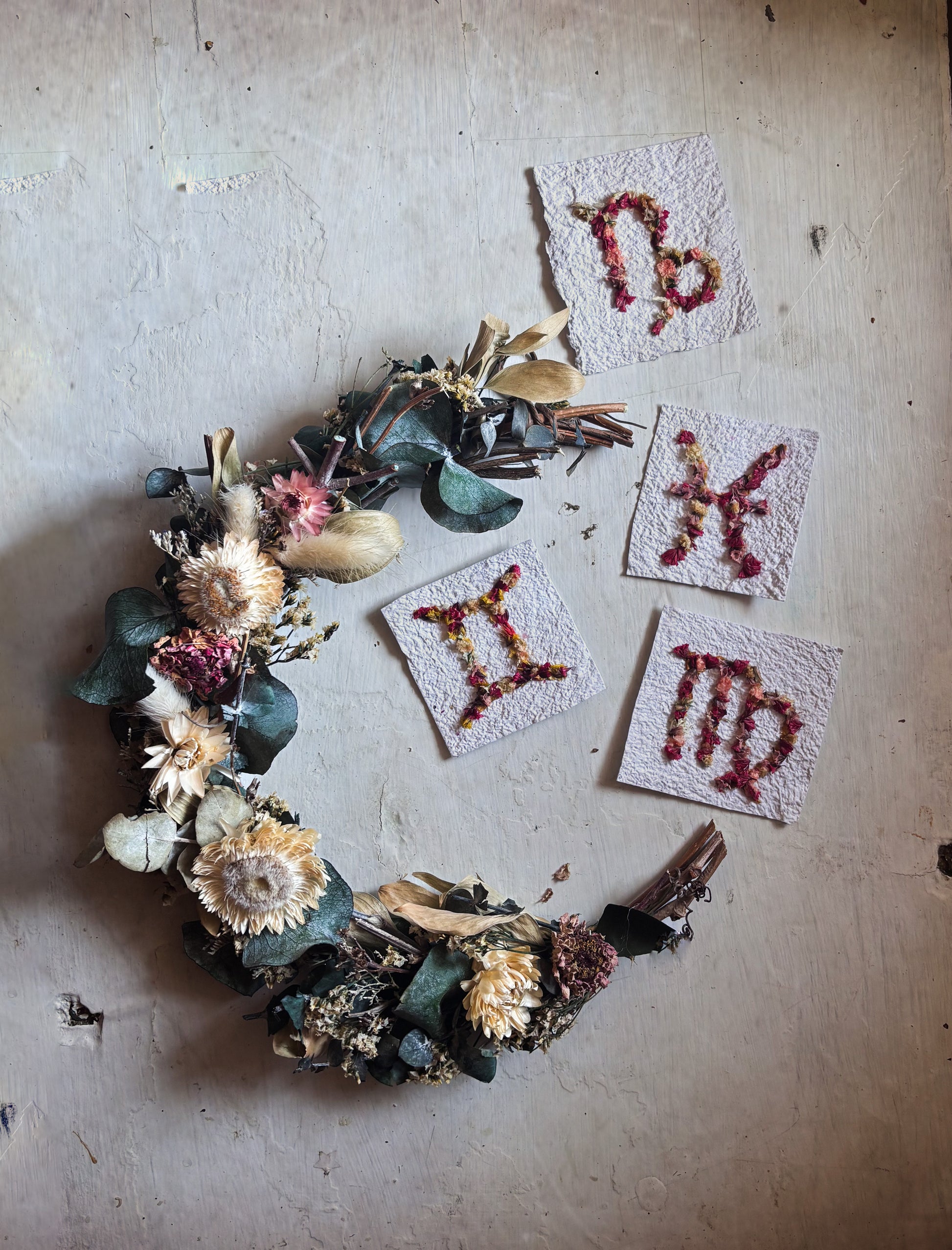 Apportez une touche d’élégance naturelle à votre intérieur avec une couronne de fleurs séchées, uniques et faites à la main à partir de fleurs recyclées.