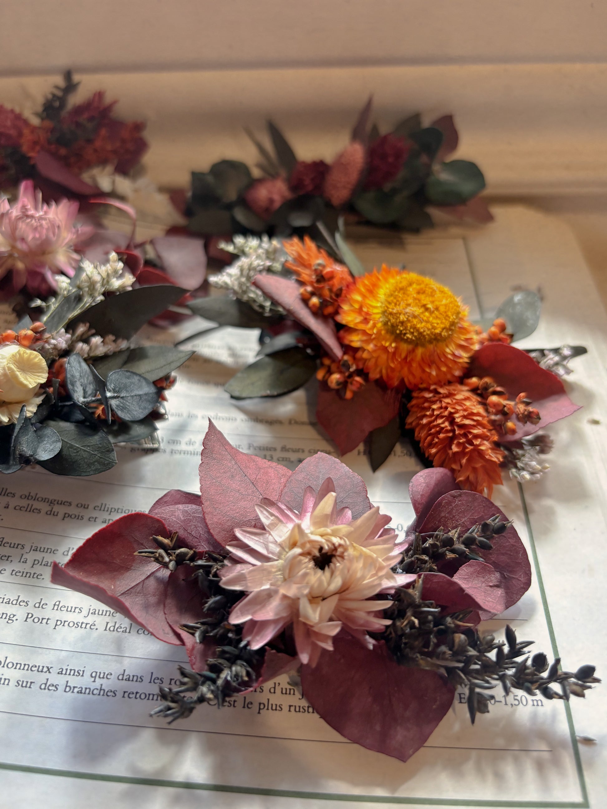 Les accessoires pour les cheveux sont fabriqués à partir de fleurs séchées et stabilisées surcyclées. Les supports sont en plastique où en métal en fonction du produit. .