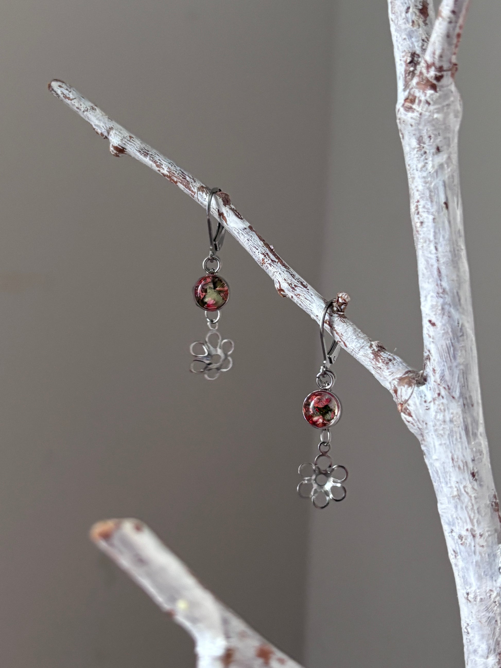 Laissez vous séduire par ces boucles d'oreilles en acier inoxydable hyppoallergénique, réalisée à partir de fleurs séchées qui sont délicatement insérées dans de la résine.