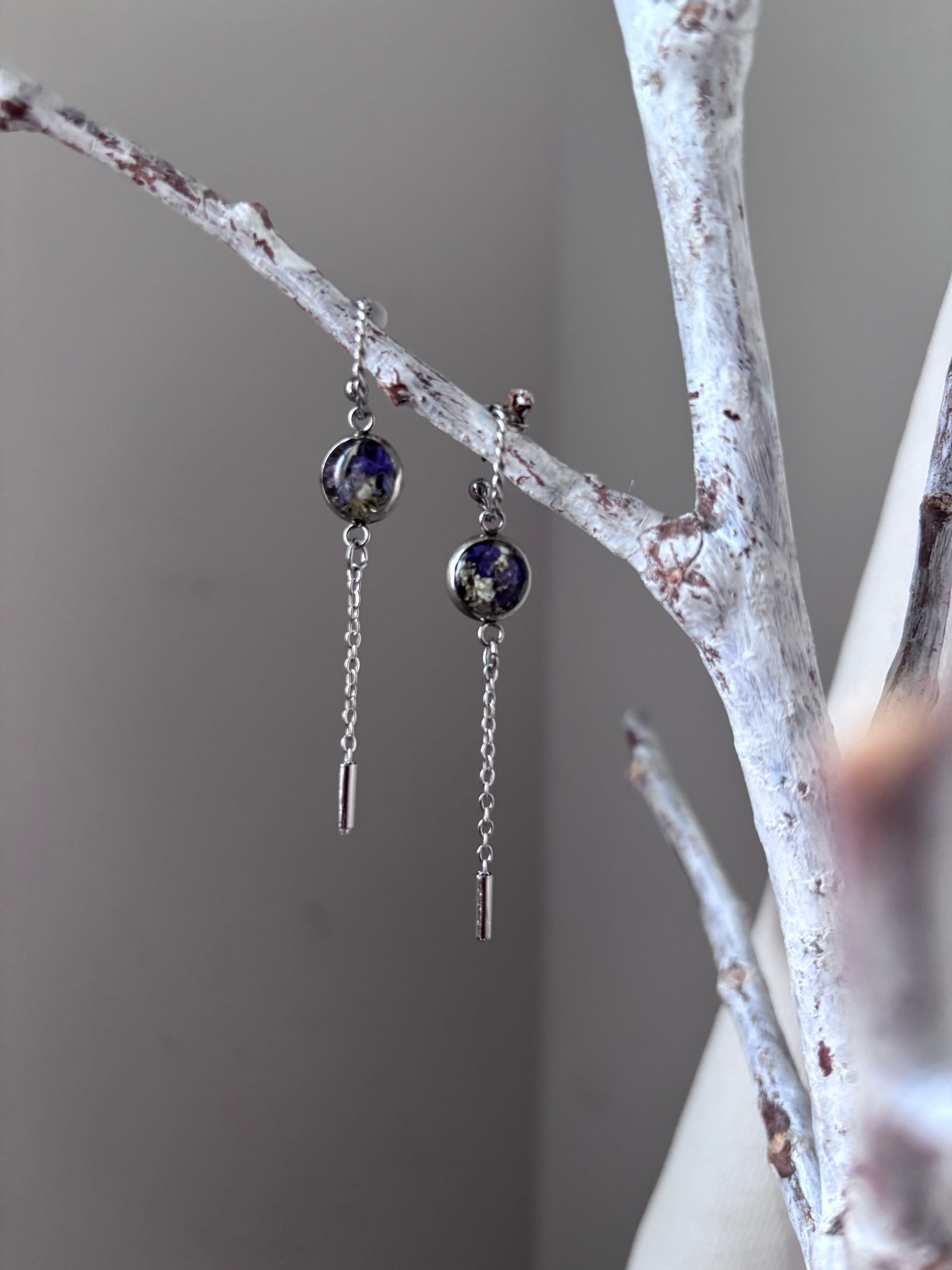 Laissez vous séduire par ces boucles d'oreilles en acier inoxydable hyppoallergénique, réalisée à partir de fleurs séchées qui sont délicatement insérées dans de la résine.